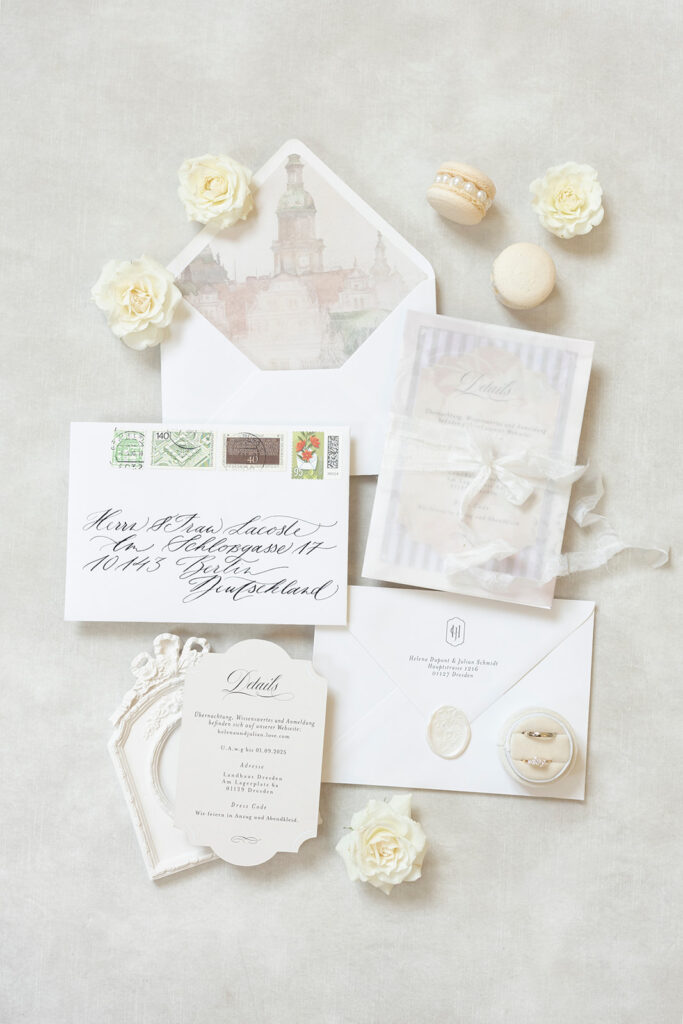 Meine separat buchbaren Kalligrafie-Services eignen sich ideal, um bereits anderweitig gestalteten Einladungen oder Umschlägen eine individuelle, elegante Note zu verleihen – ebenso wie Platzkarten, Escort Cards und Sitzplänen, die auf Ihr Event abgestimmt sind.